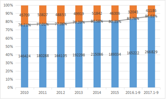 另外,根據(jù)中國(guó)工程機(jī)械工業(yè)協(xié)會(huì)工業(yè)車輛分會(huì)收集統(tǒng)計(jì)的數(shù)據(jù)來分析,同樣也是從2010年開始,一直到2017年的9月份,內(nèi)資品牌的叉車在中國(guó)國(guó)內(nèi)銷售的叉車總量占比也是在逐年提高,從2010年的76.21%,上升到今年截止到9月份的86.63%。充分說明了國(guó)產(chǎn)叉車與進(jìn)口叉車的差距正在逐步縮小。