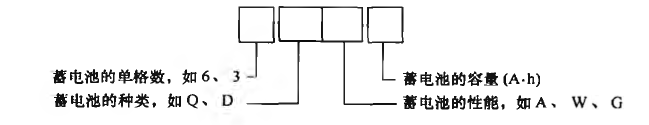 例如6-QA-165DFB表示為:額定電壓12V,額定容量165A.h,起動用、干荷電、帶液、防酸、半密閉式蓄電池。