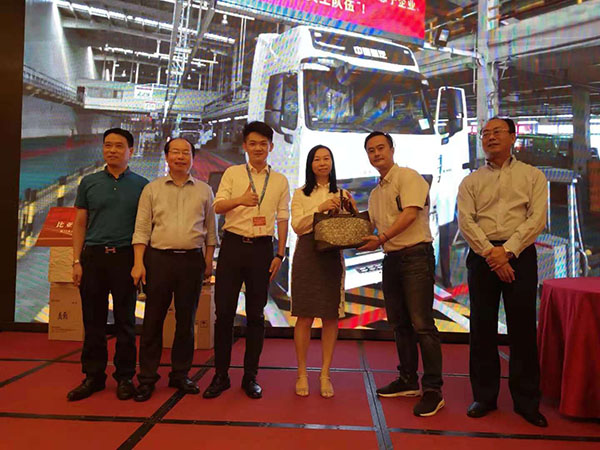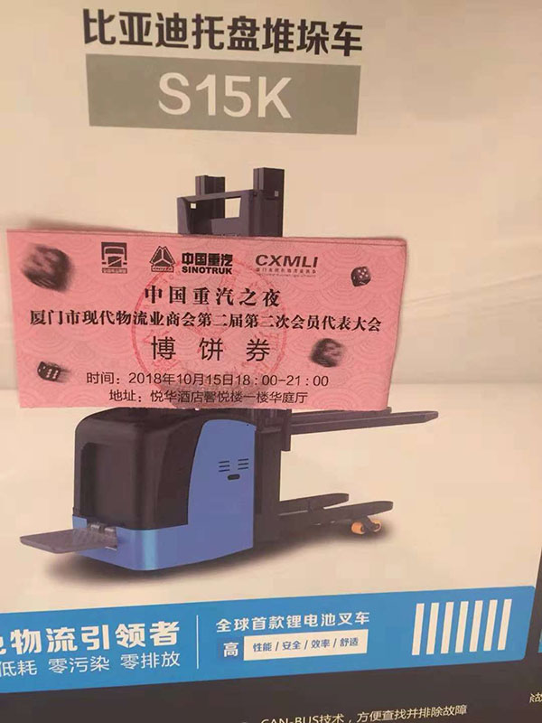 2018年10月15日,全國集運(yùn)年會在廈勝利召開暨廈門現(xiàn)代物流商會二屆二次會議中秋晚會順利舉行!廈門永新昌機(jī)械設(shè)備有限公司贊助二臺比亞迪小鋰電動叉車!恭喜中國重汽,段先生!獅翔物流有限公司何先生喜各得一臺比亞迪叉車!