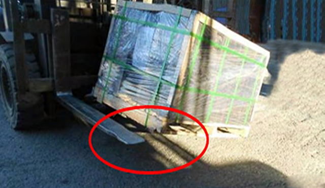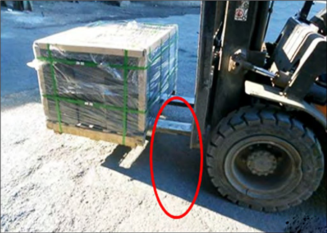 叉車作業(yè)時(shí)貨叉未完全插入到載荷下方。根據(jù)《機(jī)動(dòng)工業(yè)車輛 安全規(guī)范》14.2.2.2-b:貨叉必須盡可能深地插人到載荷的下方。但注意不得使叉尖碰到載荷以外的物件。然后貨叉必須起升到足夠的高度以揀取載荷。