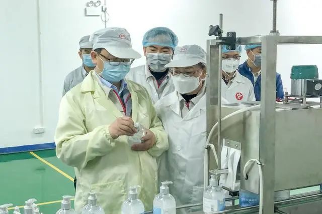 比亞迪股份有限公司董事長(zhǎng)兼總裁王傳福向比亞迪中研院院長(zhǎng)宮清博士了解免洗手消毒凝膠的生產(chǎn)情況