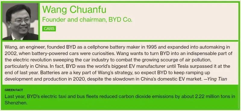 彭博社對(duì)王傳福上榜的評(píng)價(jià)是:“工程師出身的王傳福,1995年開(kāi)辦一家手機(jī)電池公司,隨后在2003年進(jìn)入汽車(chē)行業(yè),彼時(shí)電動(dòng)汽車(chē)還是新鮮事物。王傳福希望將比亞迪打造成全球電動(dòng)車(chē)革命浪潮中不可或缺的力量,用以應(yīng)對(duì)日益嚴(yán)重的空氣污染,尤其是在中國(guó)。電池是王傳福企業(yè)戰(zhàn)略的關(guān)鍵部分,預(yù)計(jì)比亞迪將在2020年繼續(xù)加大對(duì)于電池的研發(fā)和生產(chǎn)力度。2019年,比亞迪在深圳的純電動(dòng)出租車(chē)隊(duì)和公交大巴車(chē)隊(duì)減少了約222萬(wàn)噸二氧化碳排放。”