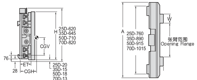 | Capacity 承載能力(kg) | Catalog Order NO 型號 | Mounting Class 安裝等級 | Opening Range張臂范圍(mm) | Arm Pad Size基板尺寸WxHxT(mm) | Frame Width 框架寬度A(mm) | Vertcial Center Of Gravity垂直重心CGV(mm) | Weight 自重(kg) | Effective 失載距ET(mm) | Horizontal Center of Gravity 水平重心CGH(mm) |